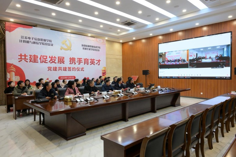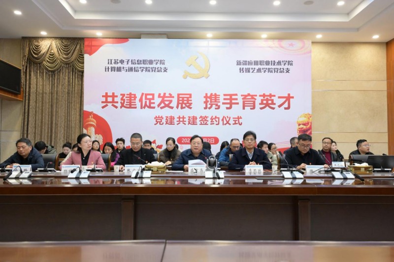 12 月 2 日,江苏电子信息职业学院计算机与通信学院党总支与新疆应用职业技术学院传媒艺术学院党总支在线上开展“共建促发展 携手育英才”党建共建签约仪式暨首次主题党日活动。此次活动学习贯彻习近平总书记重要讲话精神,积极响应国家东西部协作战略,旨在打破地域壁垒,推动职业教育跨区域资源整合与协同提质,为两地院校在党建引领、教学改革、文化育人等领域深化合作奠定基础。校党委副书记盛定高、校党委委员、宣传部部长李思政出席活动,校党委委员、组织部部长、统战部部长张广川主持会议,两校相关院系师生代表参与活动。