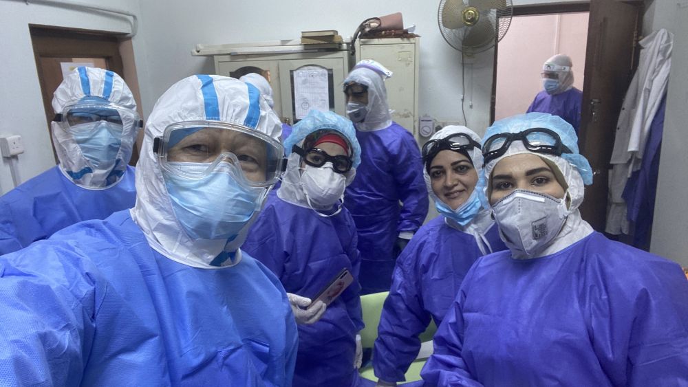 4月14日,在伊拉克巴格达一家定点收治医院,专家组成员韩孟杰(左二)、杨鸿辉(左一)与伊拉克医护人员合影。中国红十字会援助伊拉克防治新冠肺炎医疗专家组近日走进巴格达多家定点收治医院,深入病房,与伊方专家交流临床诊治与防控方案,分享中国经验。(新华社发)