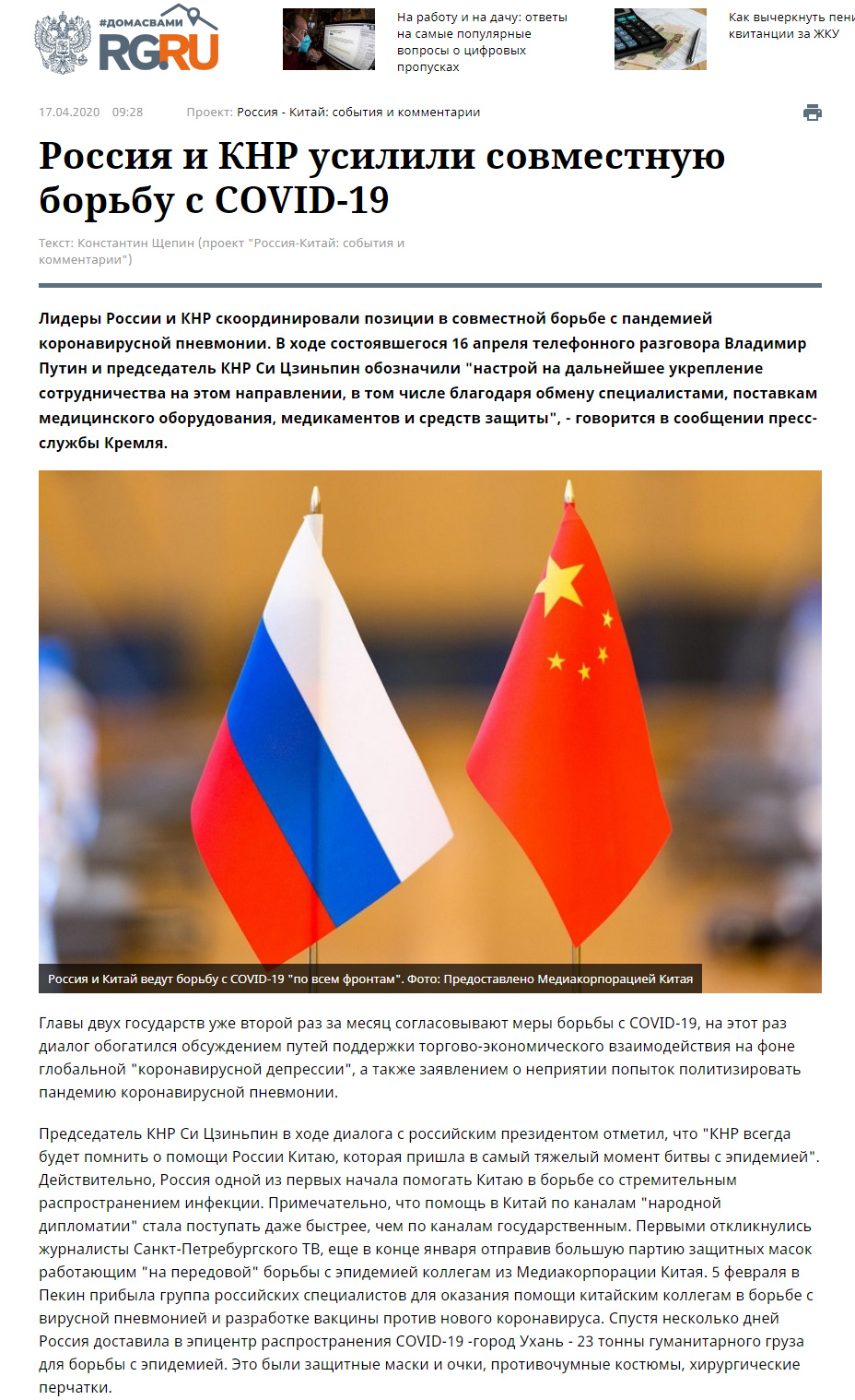 《俄罗斯报》网站17日刊发题为《中俄锐评:中俄同心 共抗疫情》的评论文章。文章指出,在全球抗疫的关键时刻,中俄元首在一个月内两次通电话共商合力抗疫,共同谴责“政治病毒”,凸显了两国关系的高水平和特殊性。文章强调,中俄开展全方位抗疫合作的经验为世界提供了重要借鉴。文章编译如下: