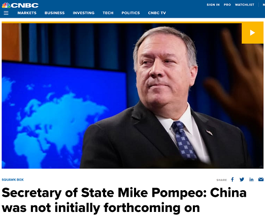 △美国国务卿蓬佩奥3月6日在接受美国消费者新闻与商业频道(CNBC)采访时声称,中方向美国提供的有关新冠病毒溯源方面的数据“不完善”,从而导致美国未能及时应对疫情,陷入了如今的被动处境。(图片来源:CNBC)