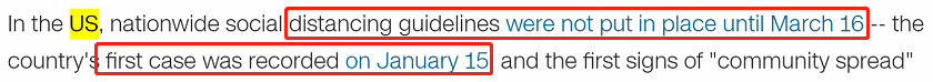 CNN在4月17日发表的评论文章中更是指出,直至3月16日,美国联邦政府才发布了第一条与保持“社交距离”有关的防疫条例。至于美国国内方面,早在1月15日,美国便已经发现了第一例新冠肺炎确诊病例,2月底发现了社区传播病例。
