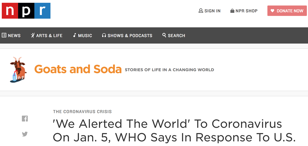 △美国国家公共广播电台(NPR)发表文章《世界卫生组织回复美国:我们已于1月5日向全球公布了新冠病毒的相关信息》(图片来源:NPR)
