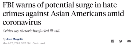 据美国旧金山州立大学的统计结果,在2月9日至3月7日之间,与歧视亚裔有关的新闻报道增长了50%。