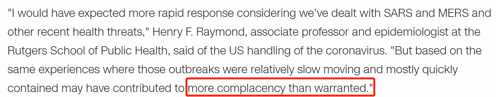“考虑到我们已经处理了SARS和MERS以及其他的公共卫生危机,我本以为美国会有更迅速的反应。但是此前这些疫情的传播相对缓慢,而且大多得到了迅速遏制,这可能会导致人们过于自满而懈怠。”