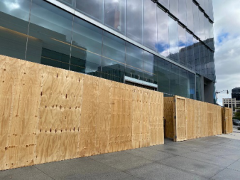 记者在美国首都华盛顿街头看到,不少临街的建筑再次用木板将玻璃防护起来,防止遭到打砸。