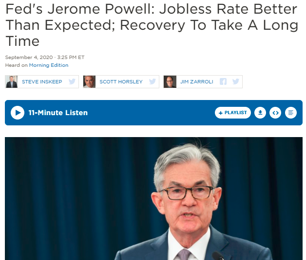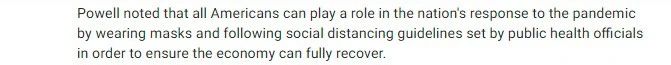实际上,这已经不是鲍威尔第一次呼吁大家戴口罩。在9月美国面临第三波疫情来袭时,鲍威尔就在接受美国全国公共广播电台(NPR)采访时说,美国可以通过戴口罩和保持社交距离来遏制病毒流行,从而获得巨大的经济增长。这被认为是他对专家建议的这两项防疫措施的最强有力的支持。