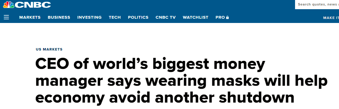 全球最大的资产管理公司之一黑石集团首席执行官拉里·芬克在接受美国消费者新闻与商业频道(CNBC)专访时也指出了戴口罩的紧迫性。芬克称:“如果我们都戴口罩,我们都更关心我们的同胞,我们将更快地解决这场危机。”