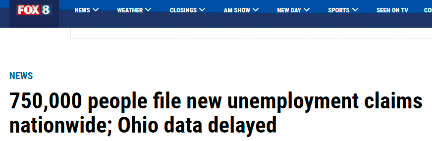 △福克斯新闻报道截图:全美有75万人首次申请失业救济