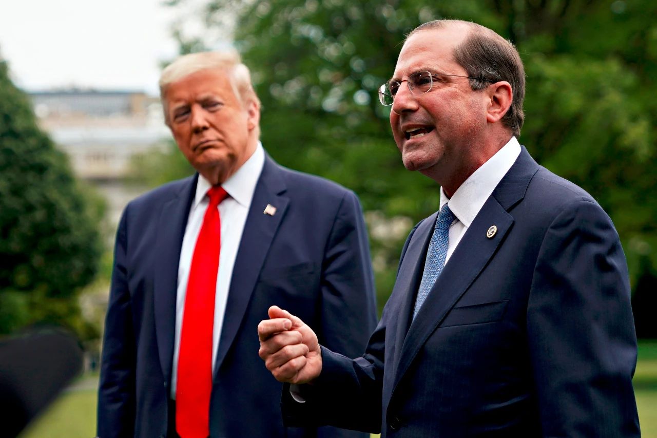 △美国卫生与公众服务部部长亚历克斯·阿扎(右)在白宫南草坪上向媒体发表讲话,美国总统特朗普站在一旁。