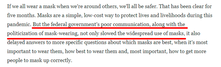 实际上,戴口罩一直是美国科学界和公共卫生专家在疫情暴发后一致强烈呼吁民众采取的基本防疫措施之一,但是始终难以有效推进。这是因为疫情暴发以来,是否戴口罩这一议题一直被美国政客严重政治化。