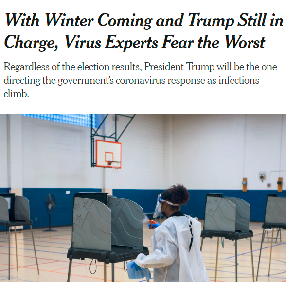 《纽约时报》3日报道称,无论美国总统大选结果如何,现任总统特朗普恐怕都将在这个冬天继续带领美国经历疫情最黑暗、最致命的时期,而他现在已经基本上把美国重要的卫生专家都排除在核心领导圈之外。