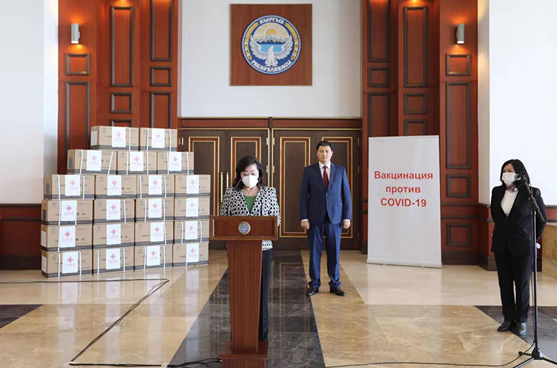 19日,中国政府援助吉尔吉斯斯坦的首批新冠疫苗运抵位于吉首都比什凯克的马纳斯机场。吉总理马里波夫、中国驻吉大使杜德文及中吉双方其他官员在机场共同出席疫苗交接仪式。