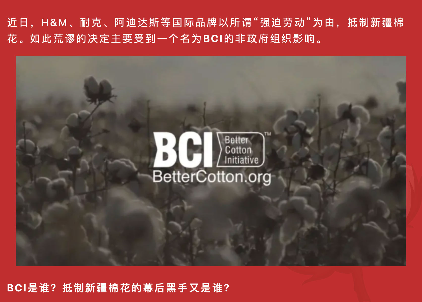 2020年10月,BCI发布了一份英文声明,捏造新疆“强迫劳动”的谣言。这家组织的上海代表处接受国内媒体采访时称,他们受到了“各方面压力”,因此做出了暂停涉及新疆棉花项目的决定。