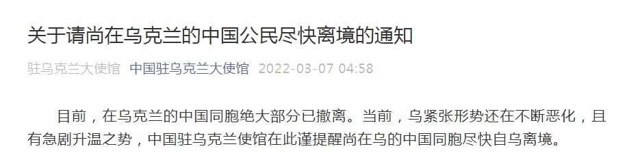 中新网3月7日日电 据中国驻乌克兰大使馆官方微信公众号消息,目前,在乌克兰的中国同胞绝大部分已撤离。当前,乌紧张形势还在不断恶化,且有急剧升温之势,中国驻乌克兰使馆在此谨提醒尚在乌的中国同胞尽快自乌离境。