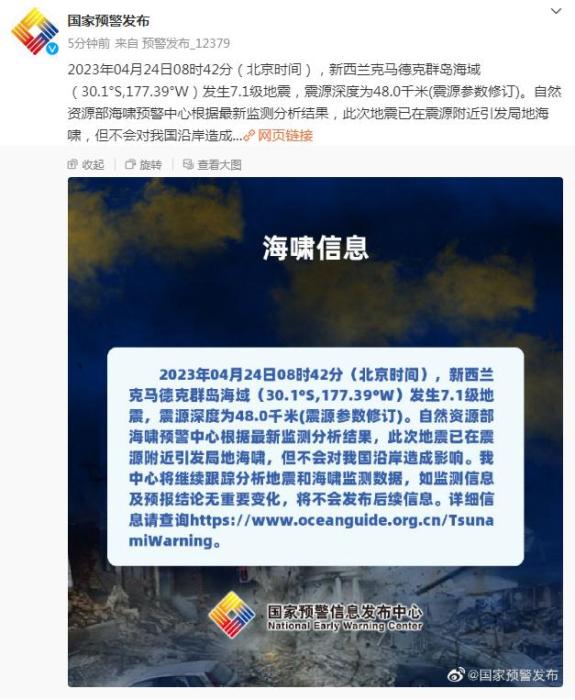中新网4月24日电 据国家预警信息发布中心官方微博消息,4月24日08时42分(北京时间),新西兰克马德克群岛海域(30.1°S,177.39°W)发生7.1级地震,震源深度为48.0千米(震源参数修订)。