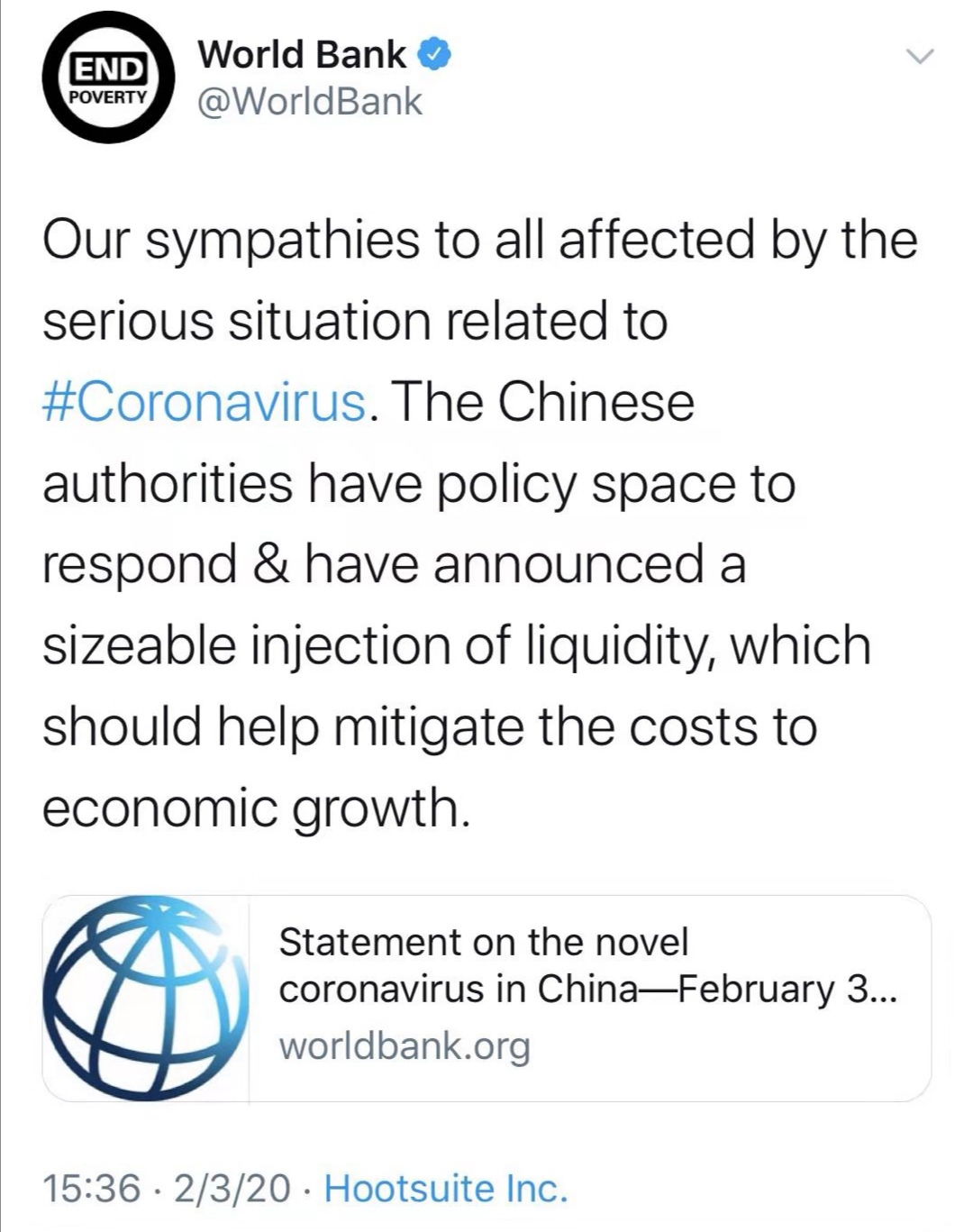 世界银行3日在官网发表声明称,中国政府有政策空间回应疫情,已经宣布了大规模注入流动性的措施,这将有助于缓和疫情对经济增长的影响。