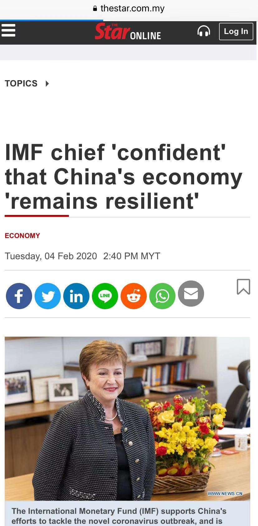格奥尔基耶娃当天在社交媒体上表示,IMF支持近来中国政府为应对疫情在财政、货币和金融等领域采取的措施。她表示,中国经济继续展现出“极强的韧性”,IMF对此“充满信心”。