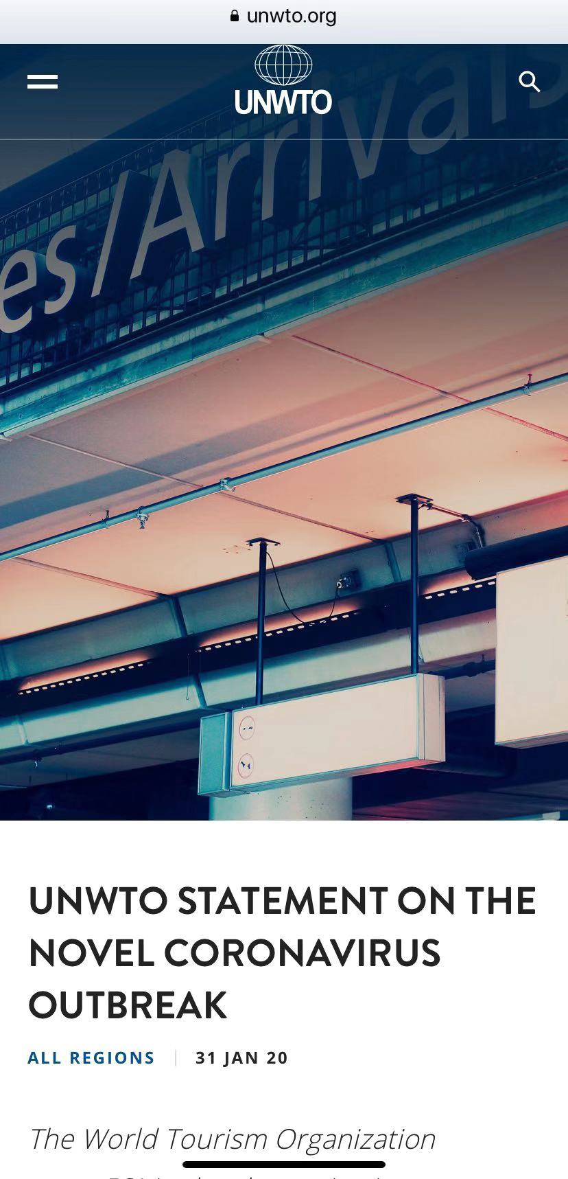 声明强调,世界旅游组织正在密切关注新型冠状病毒感染肺炎疫情发展,但全面评估疫情对全球旅游业的影响为时尚早。
