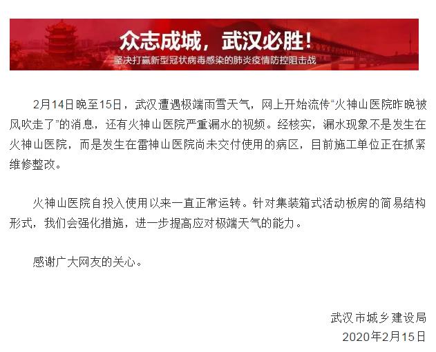 2月14日晚至15日,武汉遭遇极端雨雪天气,网上开始流传“火神山医院昨晚被风吹走了”的消息,还有火神山医院严重漏水的视频。经核实,漏水现象不是发生在火神山医院,而是发生在雷神山医院尚未交付使用的病区,目前施工单位正在抓紧维修整改。
