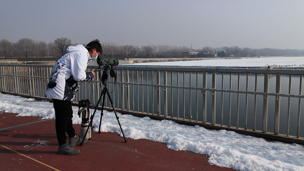 野鸭湖监测站工作人员正在观察野鸟(央广网发 北京市园林绿化局供图)