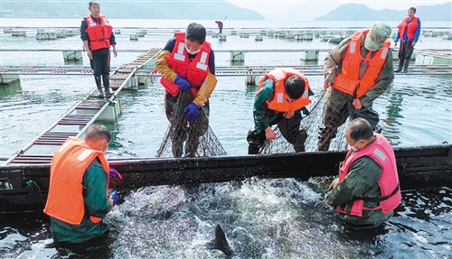 3月14日,在安徽黄山太平湖渔业公司的有机鱼暂养基地内,一条条鲜活的有机鳙鱼正从太平湖打捞上来,准备装车运往湖北武汉,带着黄山人民的深情厚谊,让爱吃活鱼的武汉市民吃上新鲜的有机鱼。 (经济日报-中国经济网记者 白海星、通讯员 周晓霞摄影报道)