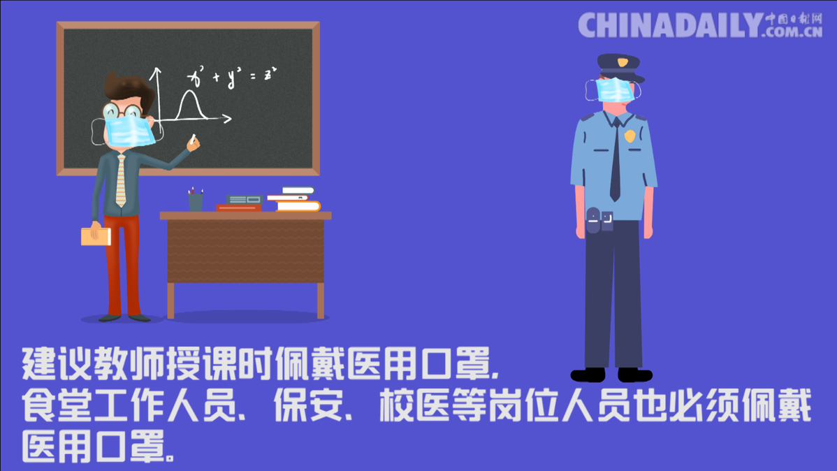 建议教师授课时佩戴医用口罩,食堂工作人员、保安、校医等岗位人员也必须佩戴医用口罩。