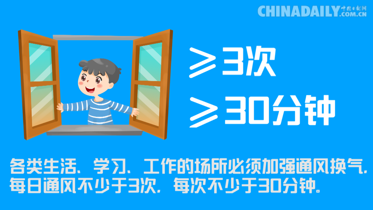 各类生活、学习、工作的场所必须加强通风换气。每日通风不少于3次,每次不少于30分钟。