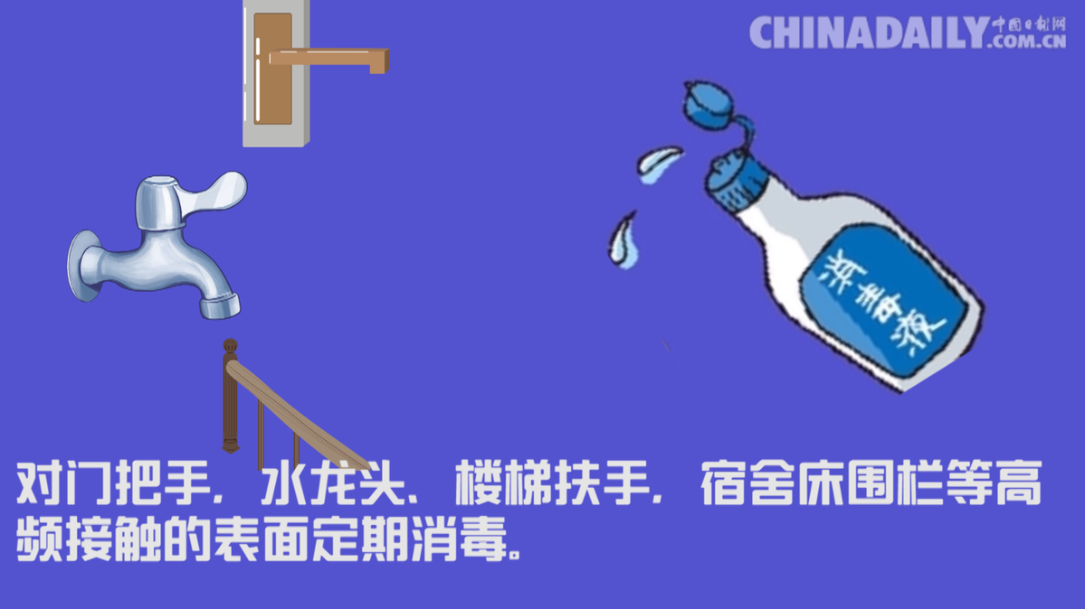 对门把手,水龙头、楼梯扶手,宿舍床围栏等高频接触的表面定期消毒。
