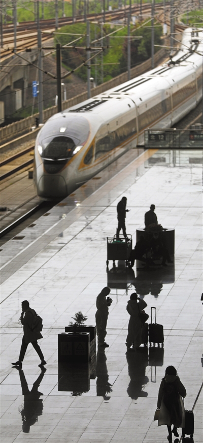 近日,在武汉火车站,一列火车缓缓进站,离汉旅客即将登车。