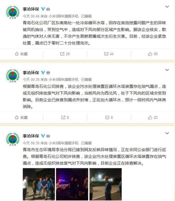 中新网8月27日电 据青岛市环境保护局李沧分局官方微博消息,针对市民反映闻到不明异味的问题,青岛市环保局李沧分局8月27日回应:青岛石化公司厂区东南角处一处冷却循环水塔,因存在柴油泄露问题产生的异味被风机抽出,带到空气中,造成对下风向部分区域产生影响。据该企业核实,散逸的气体对人体无害,不会产生易燃易爆或次生衍生灾害。目前,经该企业紧急处置,漏点已于零时二十分处理完毕。