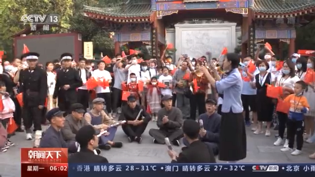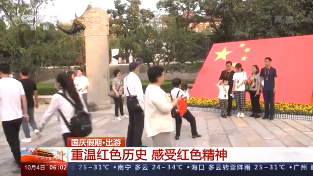 在西安,位于骊山脚下的华清宫曾是西安事变爆发地,现在成为了红色旅游经典景区、爱国主义教育基地,今年国庆假期,景区红装素裹,推出与国旗共游,打卡星耀之路,红色经典歌曲快闪等活动。游客们和演员共同唱响《南泥湾》《歌唱祖国》等耳熟能详的红色经典歌曲,歌唱祖国,抒发爱国情怀。