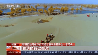 新疆克拉玛依市自驾游与房车露营协会 李明山:新疆的这个秋天全是金色的,看到的有戈壁滩、有沙漠,还有胡杨林,还有咱们这个牧民转场的牛羊,这都是大自然的风景。