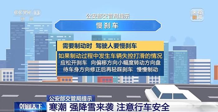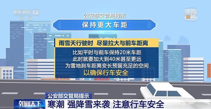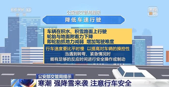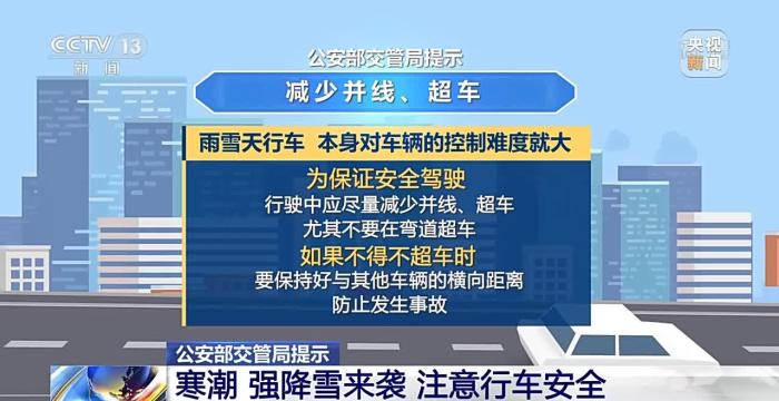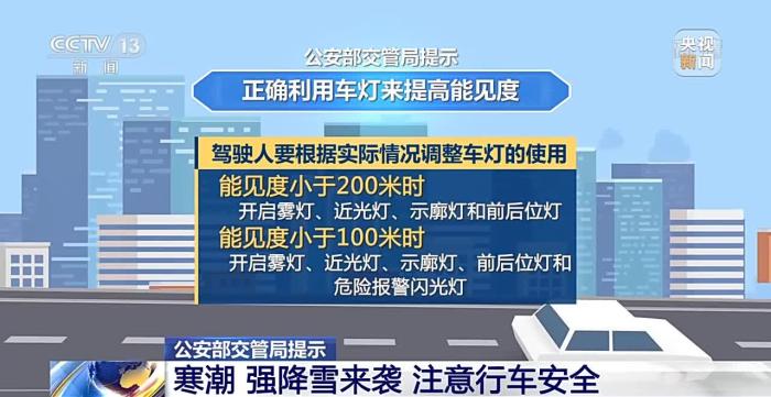 公安部交管局提示:遇降雪天气行车要牢记“降速、控距、亮尾”,打开雾灯、示廓灯、危险报警闪光灯,保持与横向、纵向车辆的安全距离。要尽量避免变道行驶、强超强会、急刹急转,以防发生危险。