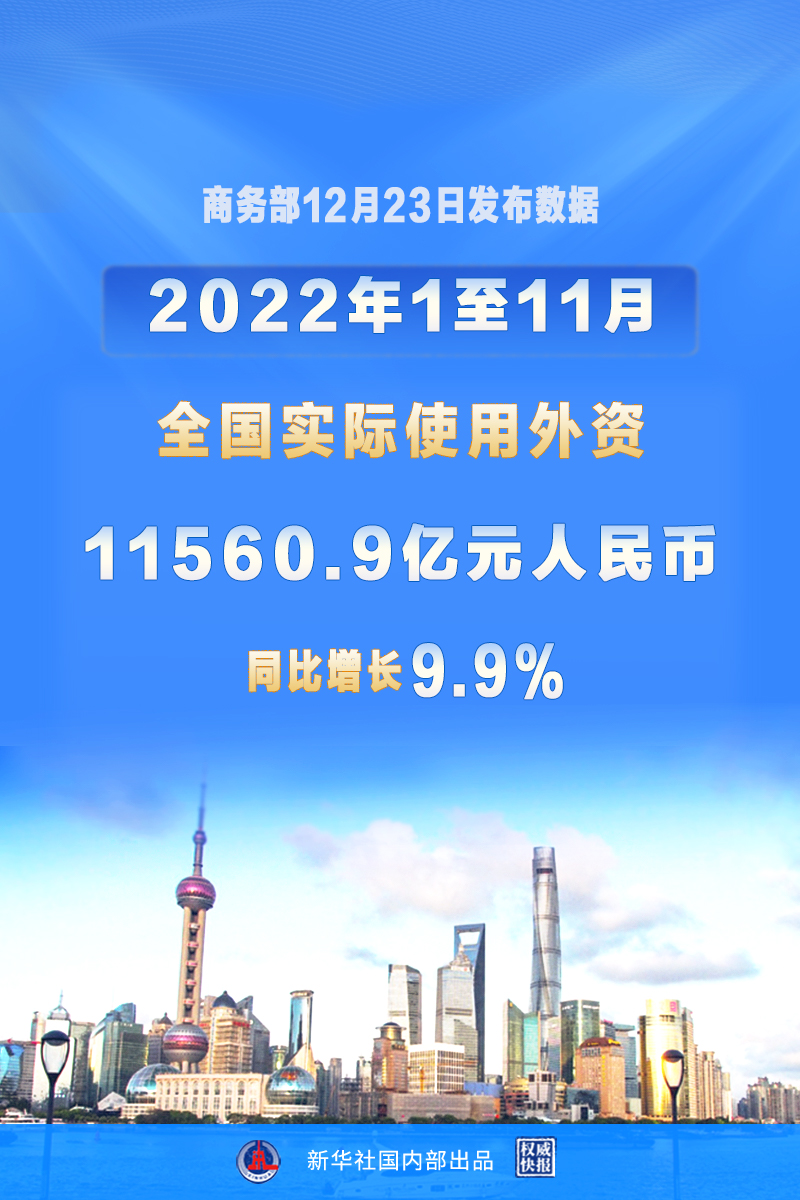 新华社北京12月23日电(记者谢希瑶)商务部23日发布数据显示,2022年1至11月,我国实际使用外资金额11560.9亿元人民币,按可比口径同比增长9.9%(下同),折合1780.8亿美元,增长12.2%。