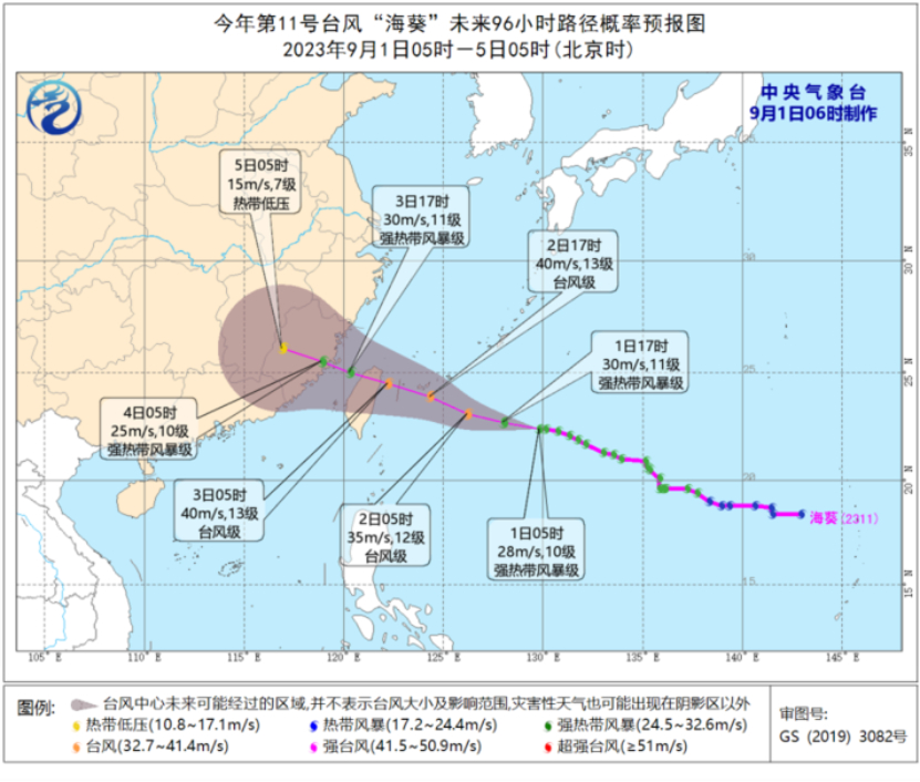图4 今年第11号台风“海葵”未来96小时路径概率预报图 来源:中央气象台网站
