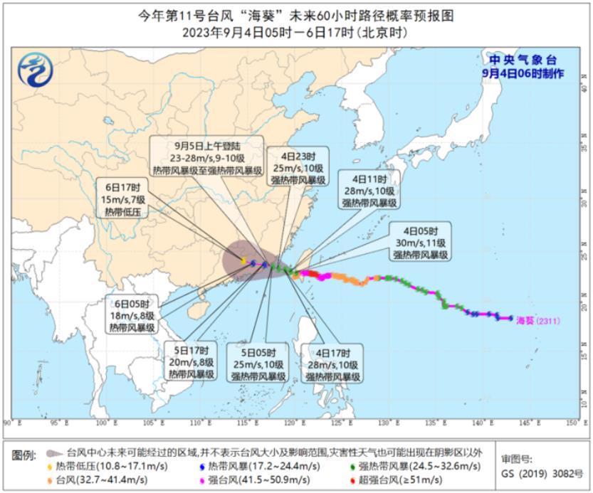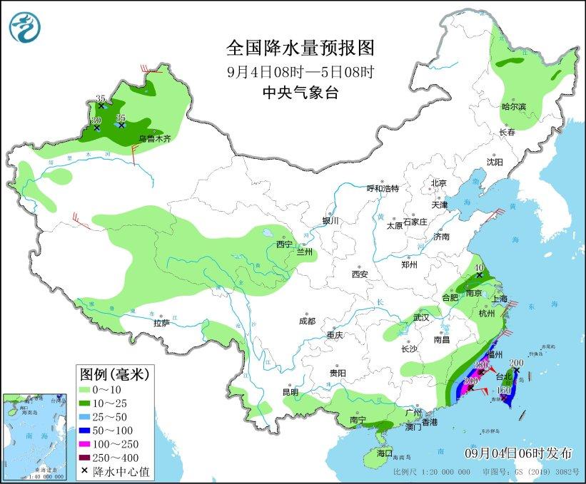 9月4日08时至5日08时,福建南部和东部、广东东部、浙江东南部、台湾岛大部等地有大到暴雨,其中,福建东部、广东东北部、台湾岛东北部和西南部等地部分地区有大暴雨,福建东南部沿海局地特大暴雨(250~300毫米)。浙江、福建东部等地有4-6级大风;东海南部海域、台湾以东洋面、台湾海峡、巴士海峡、南海东北部和中东部海域、南海南部海域、北部湾将有6~8级、阵风9~10级的大风(见图4)。