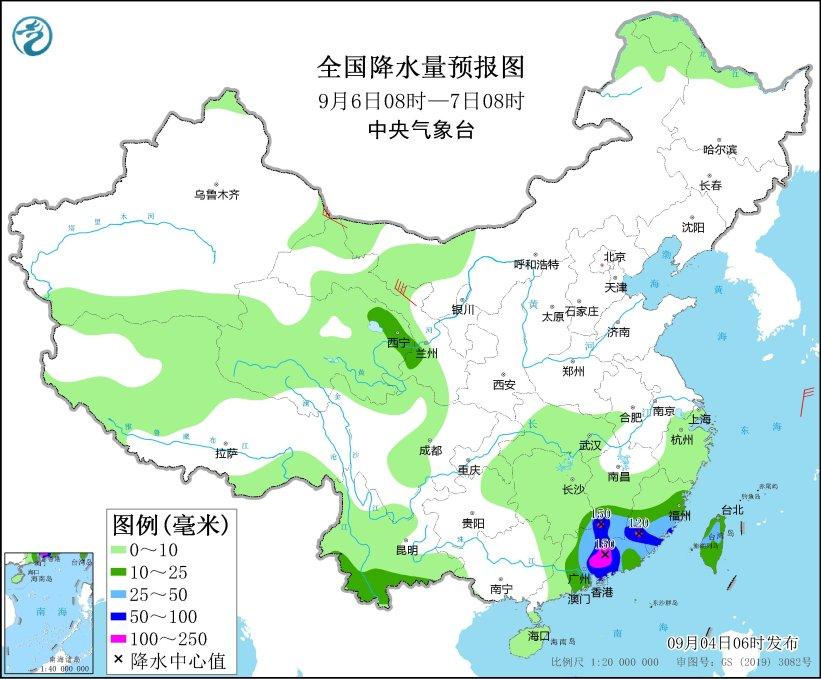 9月6日08时至7日08时,广东中东部、福建中南部、江西南部、湖南东南部、台湾岛、青海东部、云南南部等地部分地区有中到大雨,其中,江西南部、福建南部、广东中东部等地部分地区有暴雨或大暴雨(100~150毫米)(见图6)。