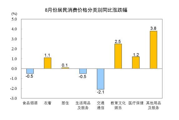8月份,全国居民消费价格环比上涨0.3%。其中,城市上涨0.2%,农村上涨0.4%;食品价格上涨0.5%,非食品价格上涨0.2%;消费品价格上涨0.4%,服务价格上涨0.1%。
