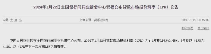 据央行网站消息,中国人民银行授权全国银行间同业拆借中心公布,2024年1月22日贷款市场报价利率(LPR)为:1年期LPR为3.45%,5年期以上LPR为4.2%。以上LPR在下一次发布LPR之前有效。