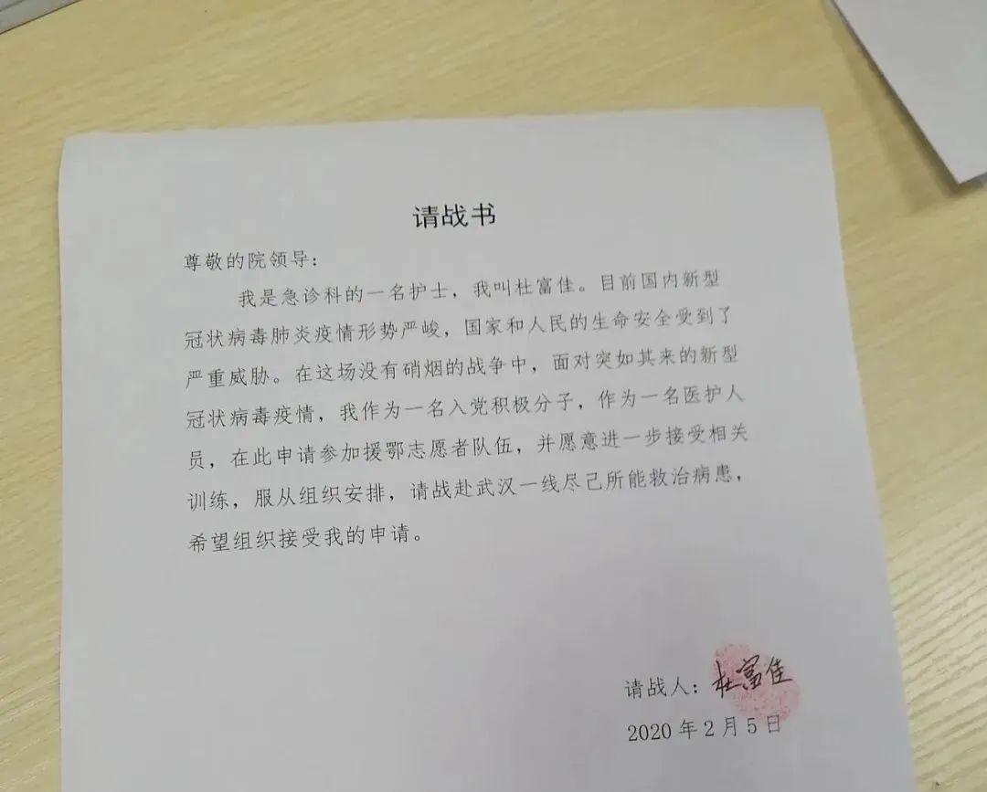 她所在的贵州省湄潭县人民医院被指定为贵州省开设新冠肺炎发热门诊的183家定点医疗机构之一。1月27日,在接到医院发出的加入抗击新冠肺炎倡议书后,杜富佳第一时间报名。2月5日,杜富佳再次提交了支援武汉抗疫一线的请战书。