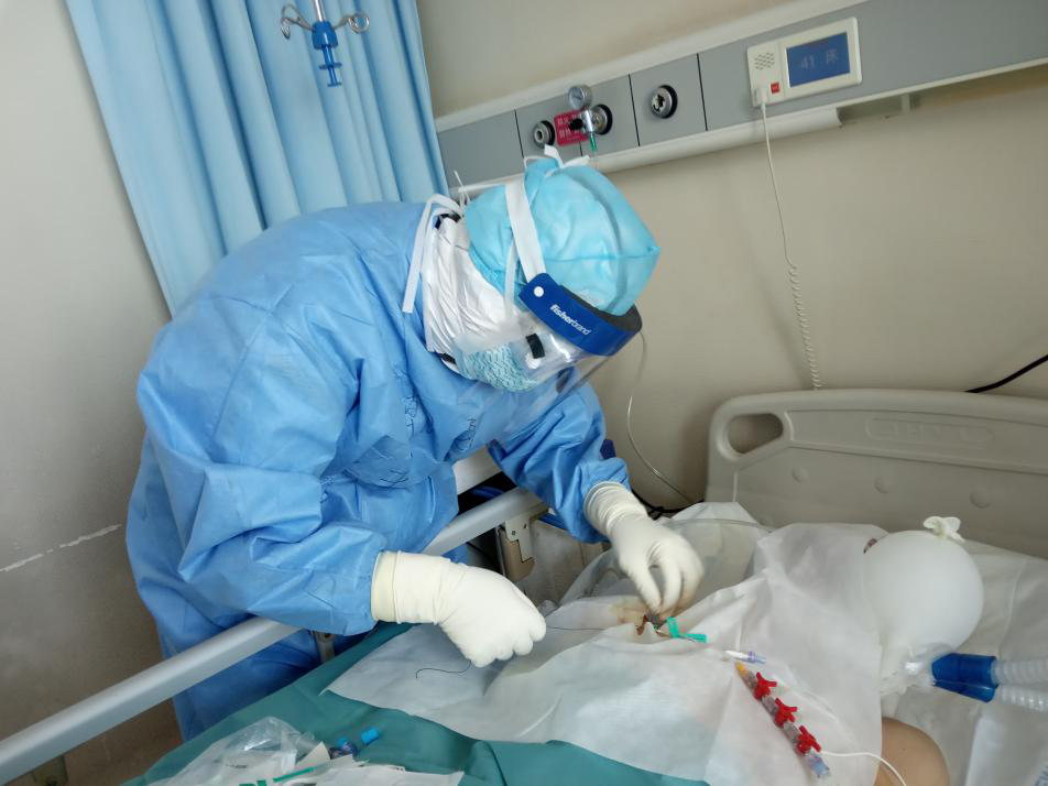 王峰正对危重患者进行中心静脉置管操作。(受访者供图)