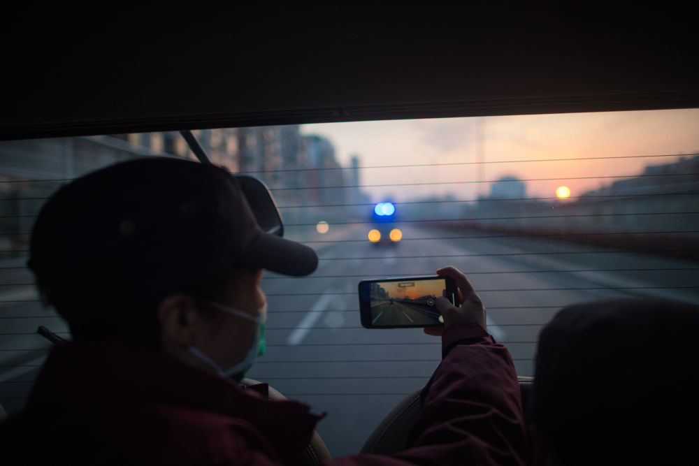 陕西国家紧急医学救援队队员在回程的车上拍摄武汉的日出(3月17日摄)。新华社记者 肖艺九 摄
