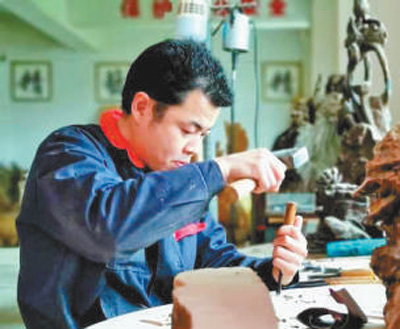 边带徒弟,边练技艺。奉湘波先后获得湖南省及全国残疾人技能比赛的大奖,被评为技术能手。在一块色泽灰暗的木墩上,刻刀上下翻飞,刀起刀落,木材特有的清香扩散,图案慢慢呈现。奉湘波给我们展示了一下精湛的技艺。