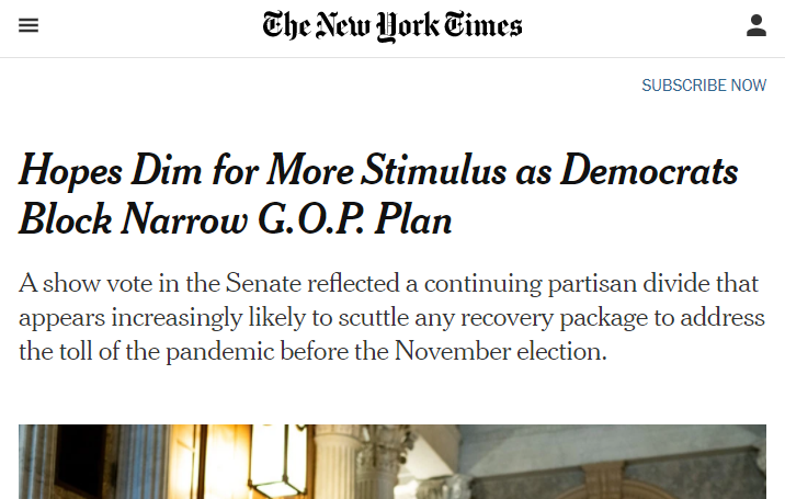 《纽约时报》报道,随着民主党人狙击了缩水版的共和党方案,美国出台新一轮疫情纾困措施的希望渺茫
