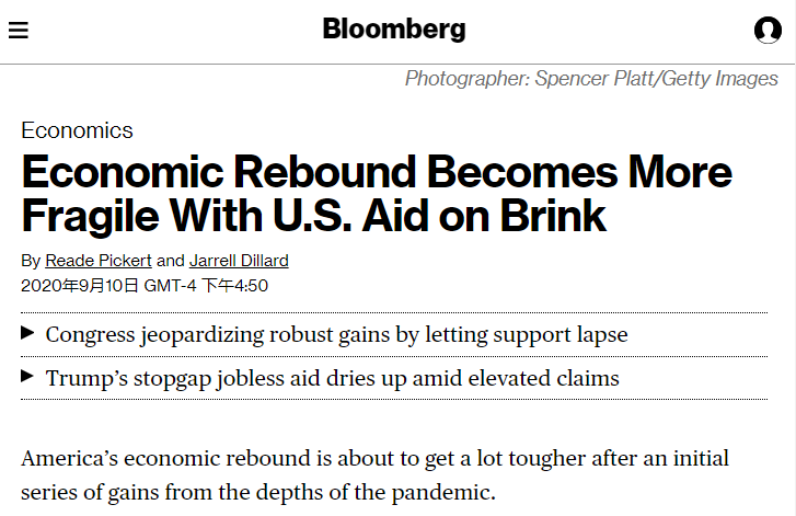 彭博社称,随着纾困措施难产,美国经济复苏变得更加脆弱