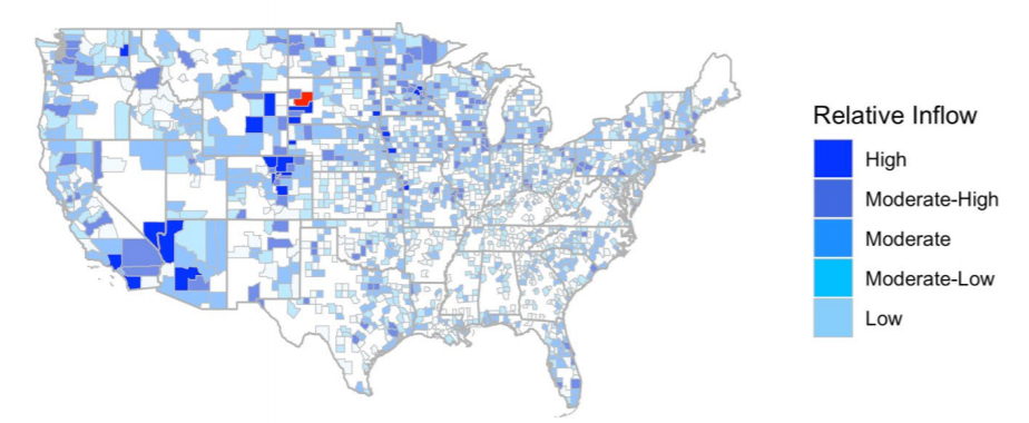 (研究人员对“摩托大会”参加人员流入全美各县的情况进行了计算,图中颜色越深显示流入人数越多)