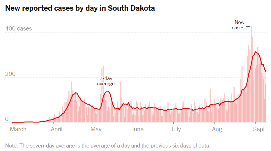 其他方面的数据也从侧面印证了摩托大会是一起“超级传播事件”。在这次大会结束不到两周之后,中西部地区的新冠确诊病例激增,尤其是南达科他州的病例两周内增加了126%。
