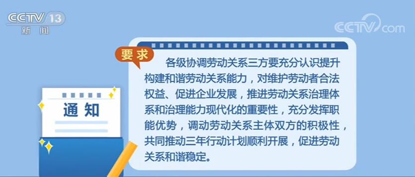 通知要求,各级协调劳动关系三方要充分认识提升构建和谐劳动关系能力,对维护劳动者合法权益、促进企业发展,推进劳动关系治理体系和治理能力现代化的重要性,充分发挥职能优势,调动劳动关系主体双方的积极性,共同推动三年行动计划顺利开展,促进劳动关系和谐稳定。