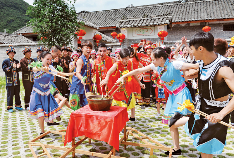 小河潺潺,果园成片,民居错落,风情别致。走进环江思恩镇陈双村,乡村美景映入眼帘,笑脸墙、《十颂党恩》长廊表达着各族群众的朴素心声。听一曲毛南的迎客歌,喝三碗苗家的土法酒,看一段瑶族的长鼓舞,再体验一次百人长桌宴,真可谓“各美其美、美美与共”。