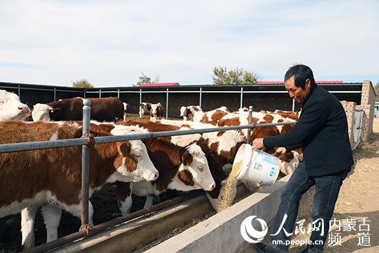 “2014年,在党和政府的帮助下我开始养牛,现在儿子跟我一起在做活牛超市。” 百兴吐嘎查牧民达福拉激动地向记者介绍。